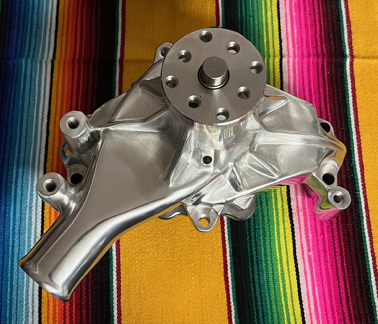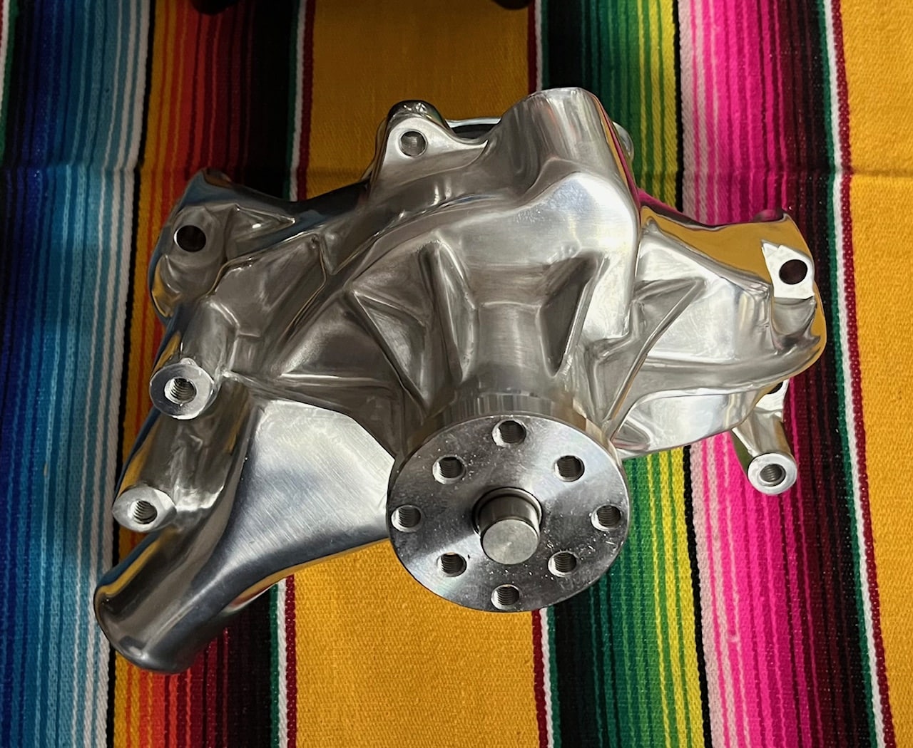 Lange Wasserpumpe für Chevrolet Small Block aus poliertem Alu, leicht und leistungsfähig, perfekt für Hot Rod und Custom Car.